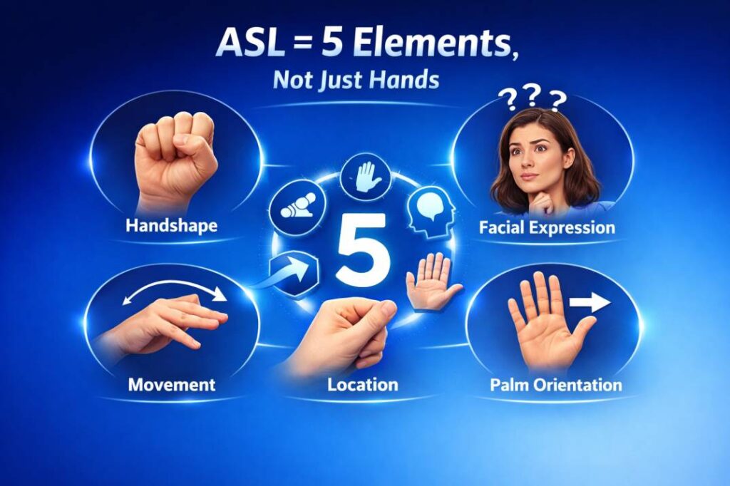 In English, you raise your voice pitch to ask a question. In ASL, you raise your eyebrows, widen your eyes, and lean your body slightly forward. The face is not just an expression in ASL – it is grammar. Without the right facial movements, a sign can change meaning entirely or become unclear.