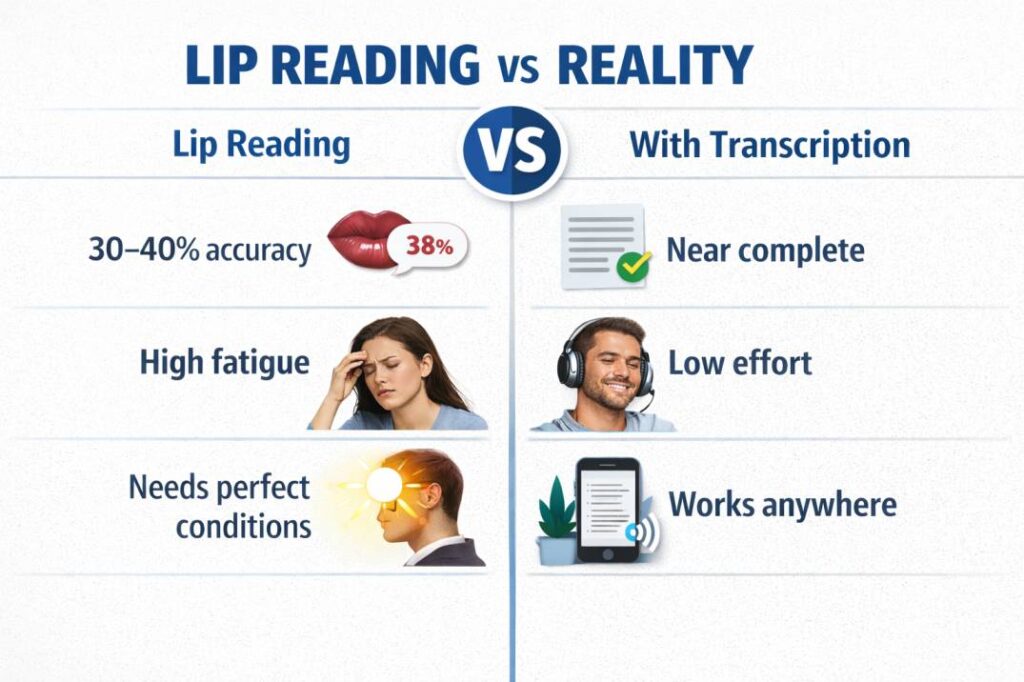 Even the most experienced lip reader is only catching around 30 to 40 percent of what is being said from lip movements alone. The rest is filled in through context, guesswork, facial expressions, and sheer mental effort. That gap is real, and pretending it does not exist does not help anyone.
